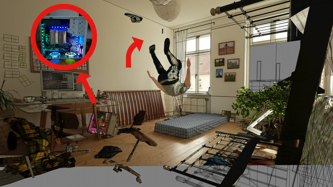 Ein Rückwärtssalto ist gefährlich. Man kann sich den Hals brechen, den Kopf stoßen oder das Handgelenk verstauchen. Alles nicht schön, deswegen macht es mein Avatar. Es übt auf einem 6-Kern Prozessor mit Hilfe von Machine Learning.