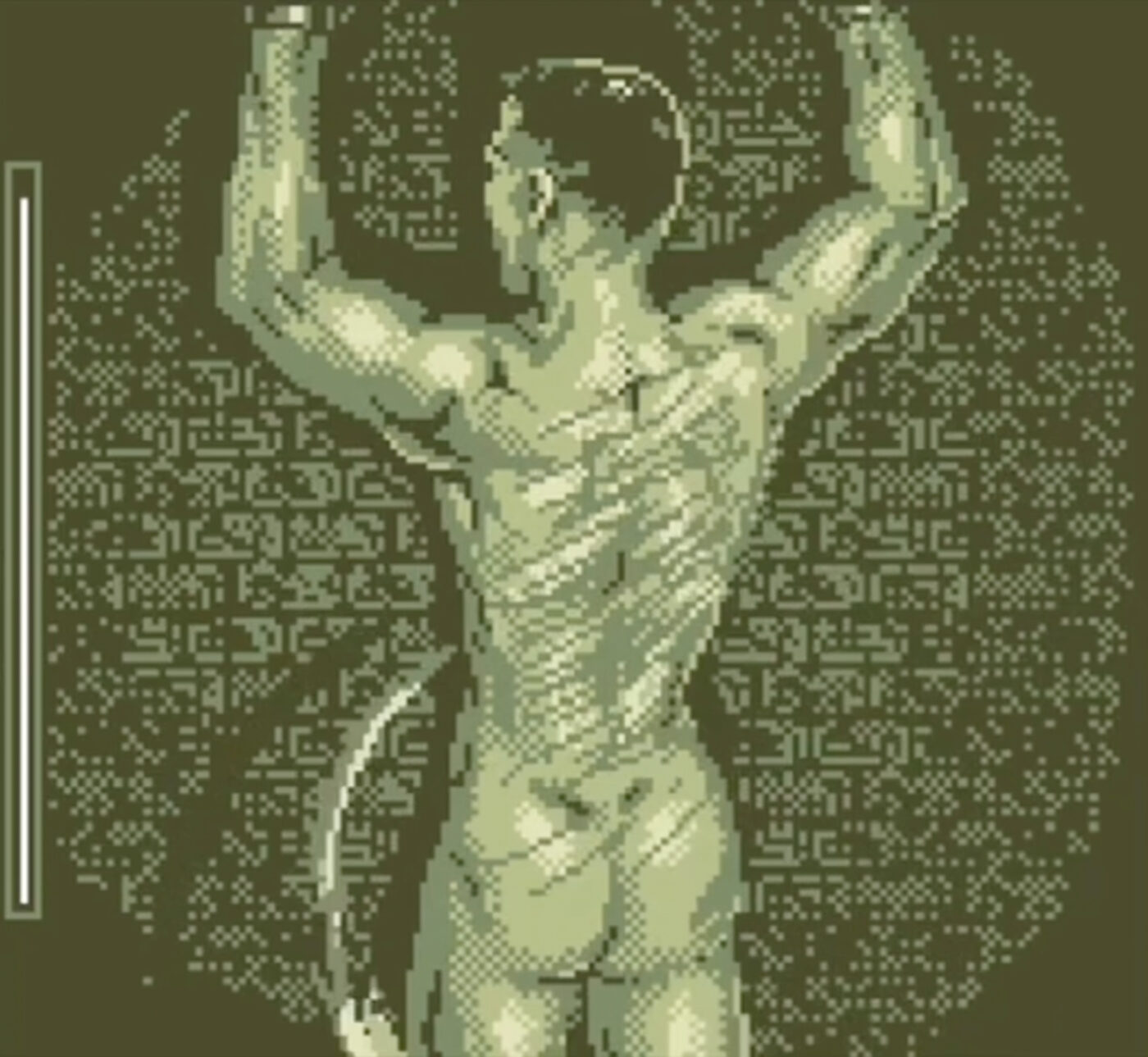 An der Wand steht ein Automat mit einem Bildschirm und einem Knopf. Die Maschine läuft und wartet darauf bedient zu werden. Das Display zeigt zu Beginn den Titel מָשִׁיחַ (mashíakh). Danach sieht man eine nackte, fixierte Person und schon kann es losgehen. 99 Wiederholungen sind möglich.